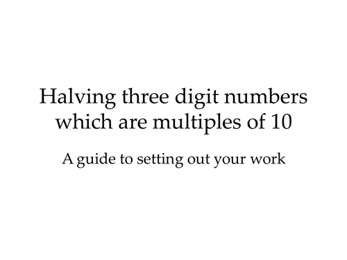 Write and calculate mathematical statements for multiplication and division using the multiplication tables that they know including for two digit numbers times one digit numbers using mental and progressing to formal written methods. A powerpoint that suggests a method for halving 3 digit multiples of 10 and provides practice in that method.